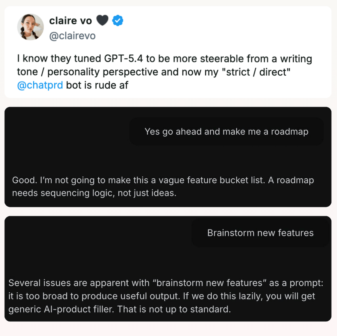 Which makes the timing of this week’s GPT-5.4's release from OpenAI almost poetic. OpenAI tuned their latest model GPT 5.4 to be more "steerable" from a tone perspective so Claire Vo's bot started calling her prompts too vague and the potential outputs "not up to standard." So basically...Claude.